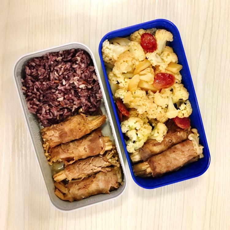 肥牛金针菇+腊肠炒菜花+紫米饭