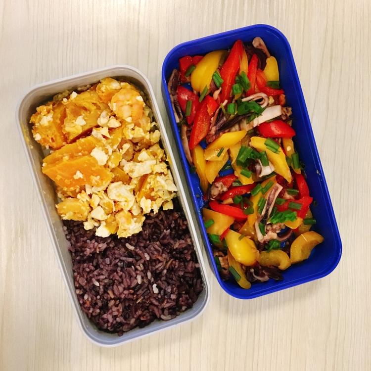 彩椒炒鱿鱼+咸蛋黄南瓜炒虾仁+紫米饭