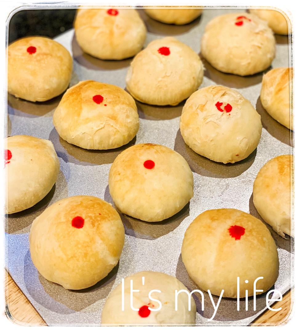 为了更加有传统味儿,用色粉点了萌萌的小红点。蛋黄酥的做法,只不过是绿豆沙馅儿。第一次尝试用猪油做,话说油酥简直粘手得不行...