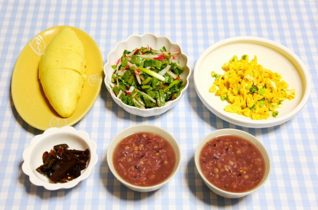 发面玉米饼+八宝粥+花椒油萝卜缨+葱花鸡蛋+韭园酱菜