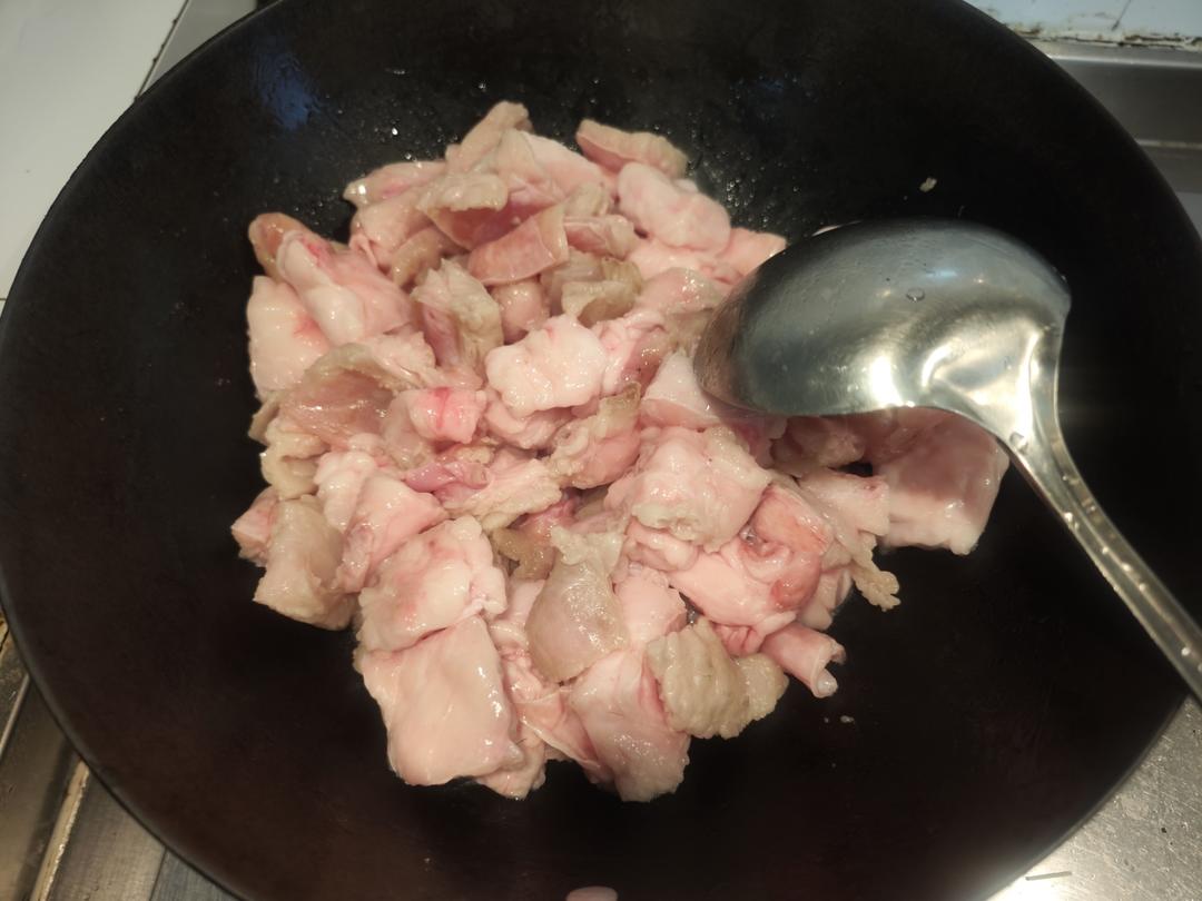 猪皮放水和花椒浸泡半小时去腥!冲洗干净后切小块 均匀(我用的厨房剪刀更快)!然后猪油块放锅里尽量平铺 100g水放锅里浸...
