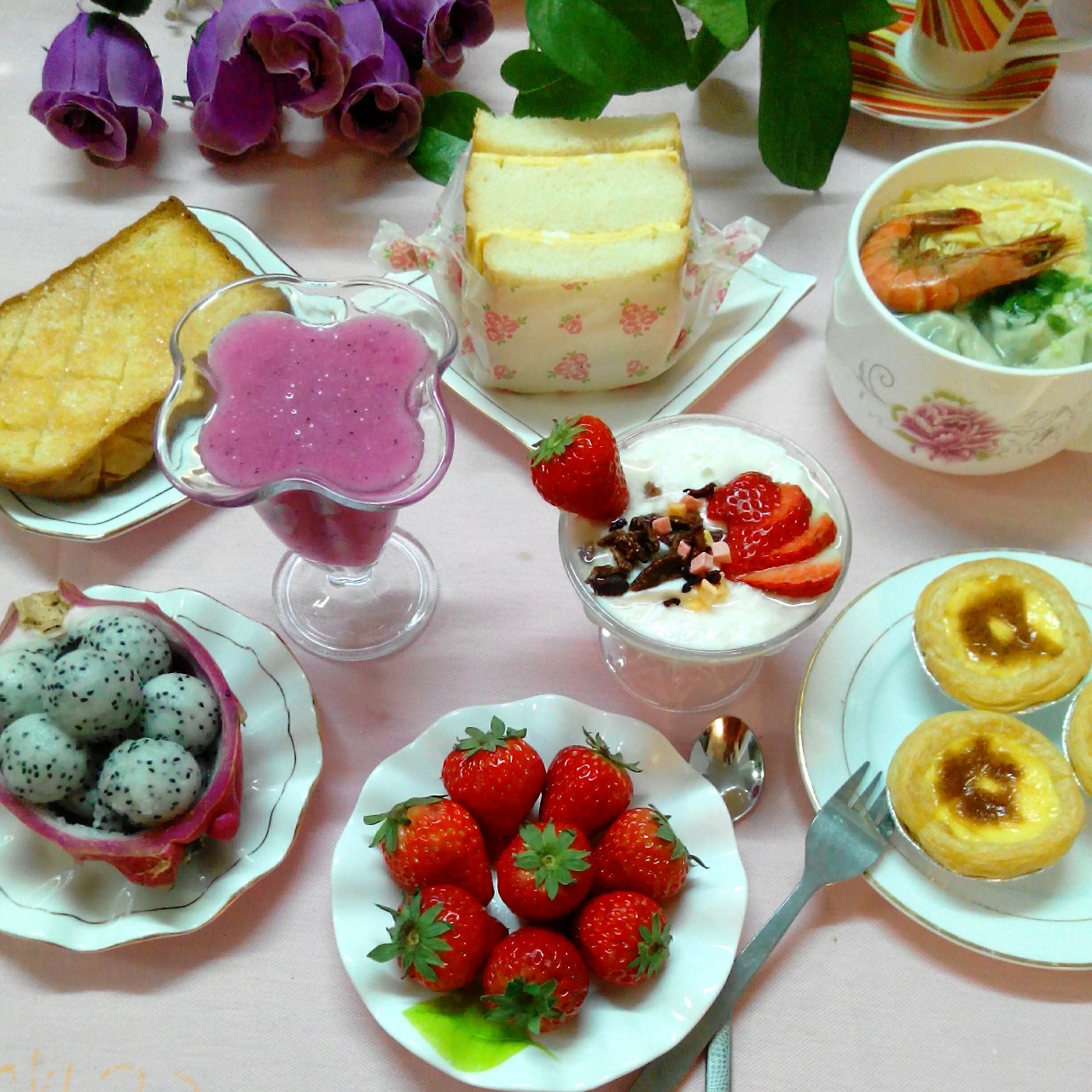 早安!给女儿下了大馄饨,现烤了蛋挞,奶油砂糖厚片吐司,鸡蛋芝士三明治,火龙果汁,水果,还有...