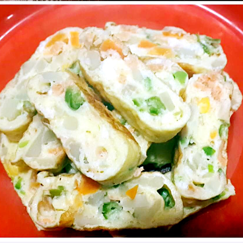 小外孙的晚餐:时蔬三文鱼厚蛋烧