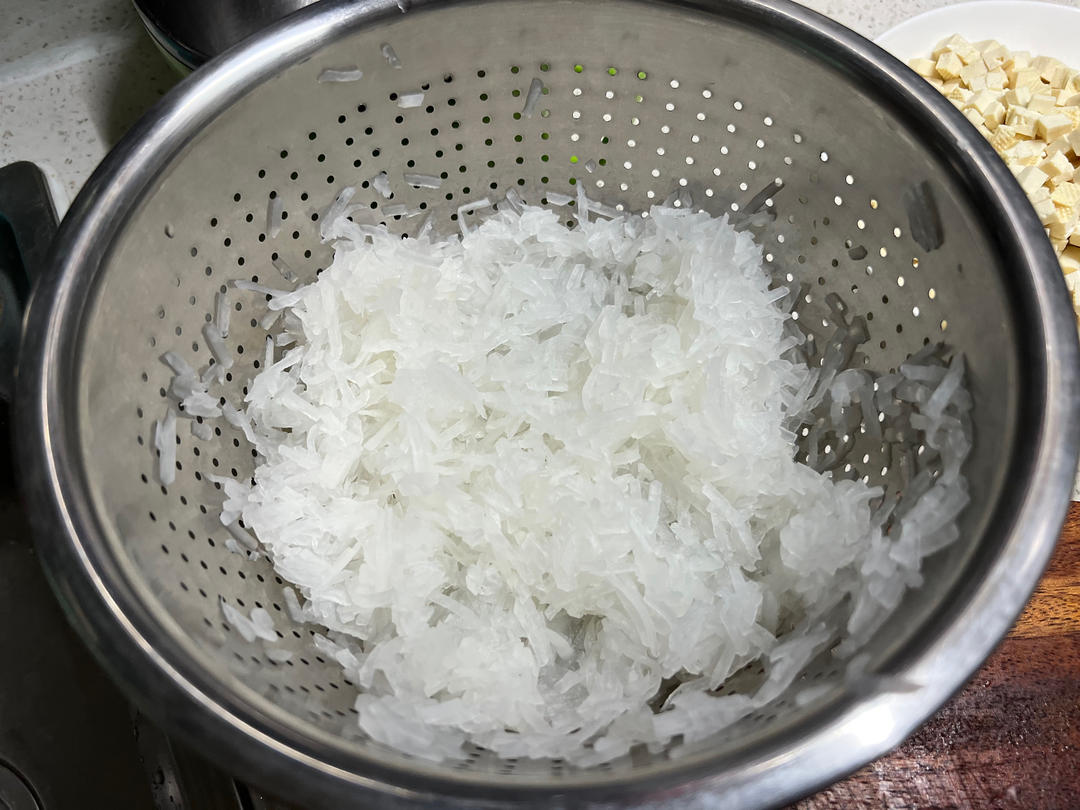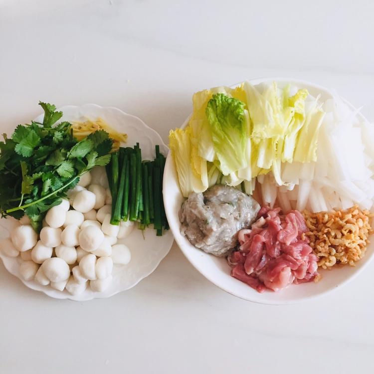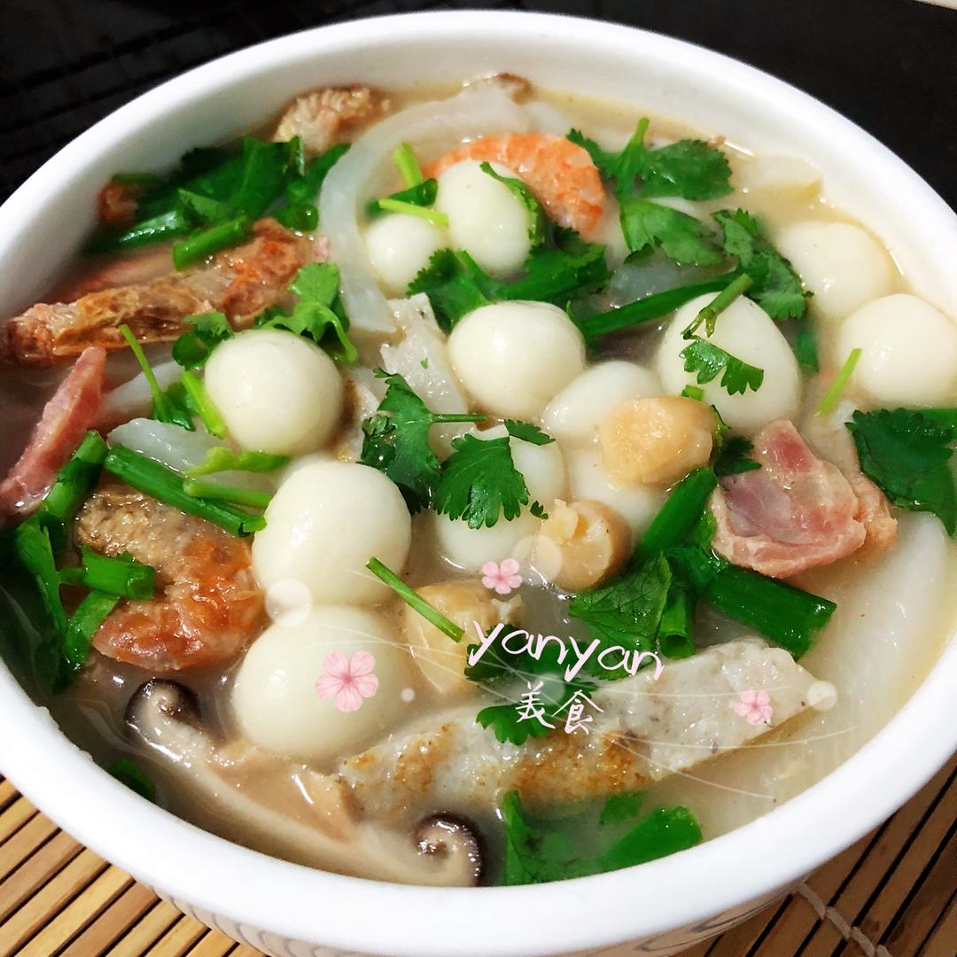 配料:冬菇,瑶柱,虾仁,虾米,鸡肉肠,蟹柳,白萝卜,胡椒粉,