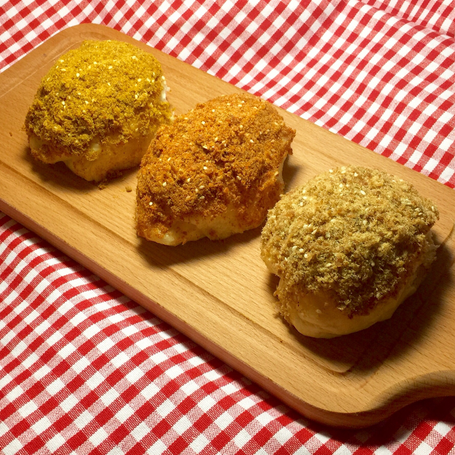 请忽略我手残的面包整形(≧∇≦),三色肉松面包,自制原味➕咖喱➕辣味肉松,过于追求肉松的蓬松那个卖命炒啊,炒得太松,粘也...