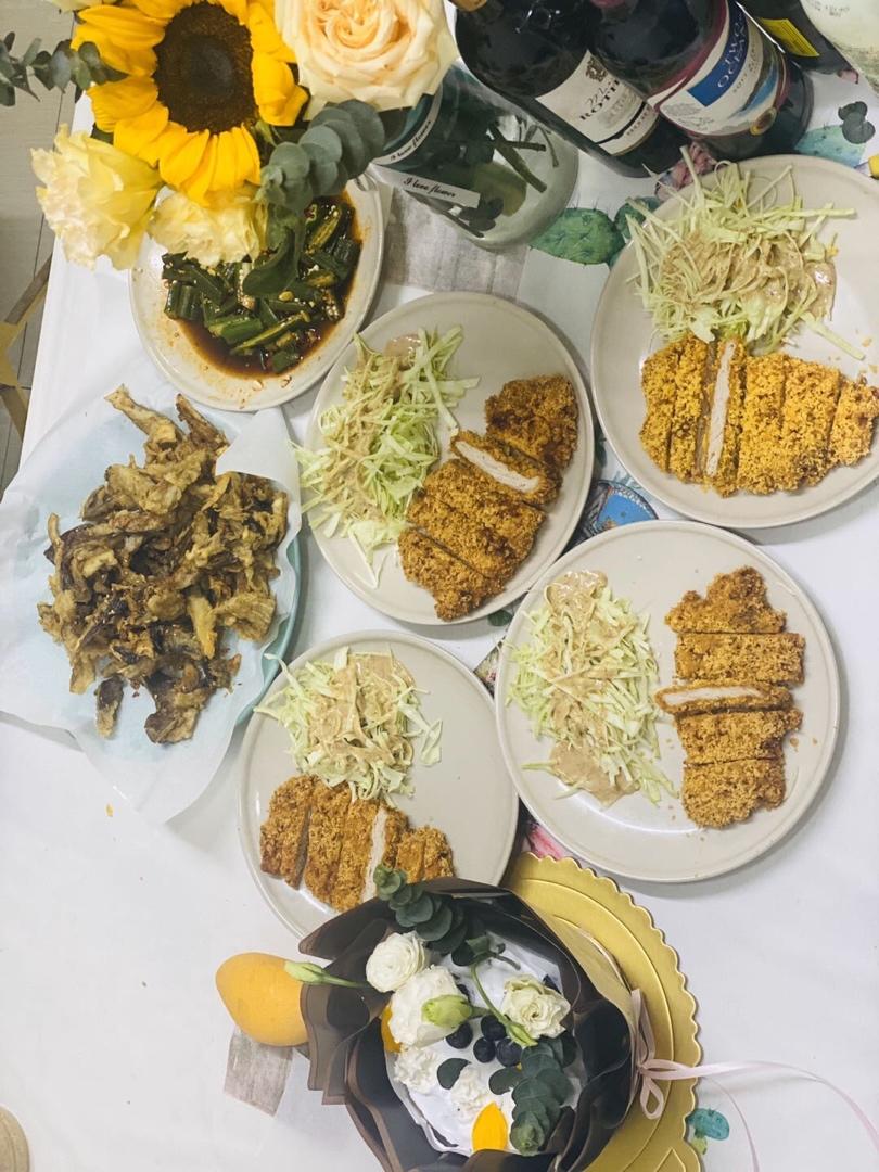 应该叫热量满满的晚餐啊🥩 炸猪排、炸蘑菇,自制了一个不太好看的蛋糕用鲜花做点缀,秋葵酸甜解腻,小酌几杯,与朋友的聚会就是...