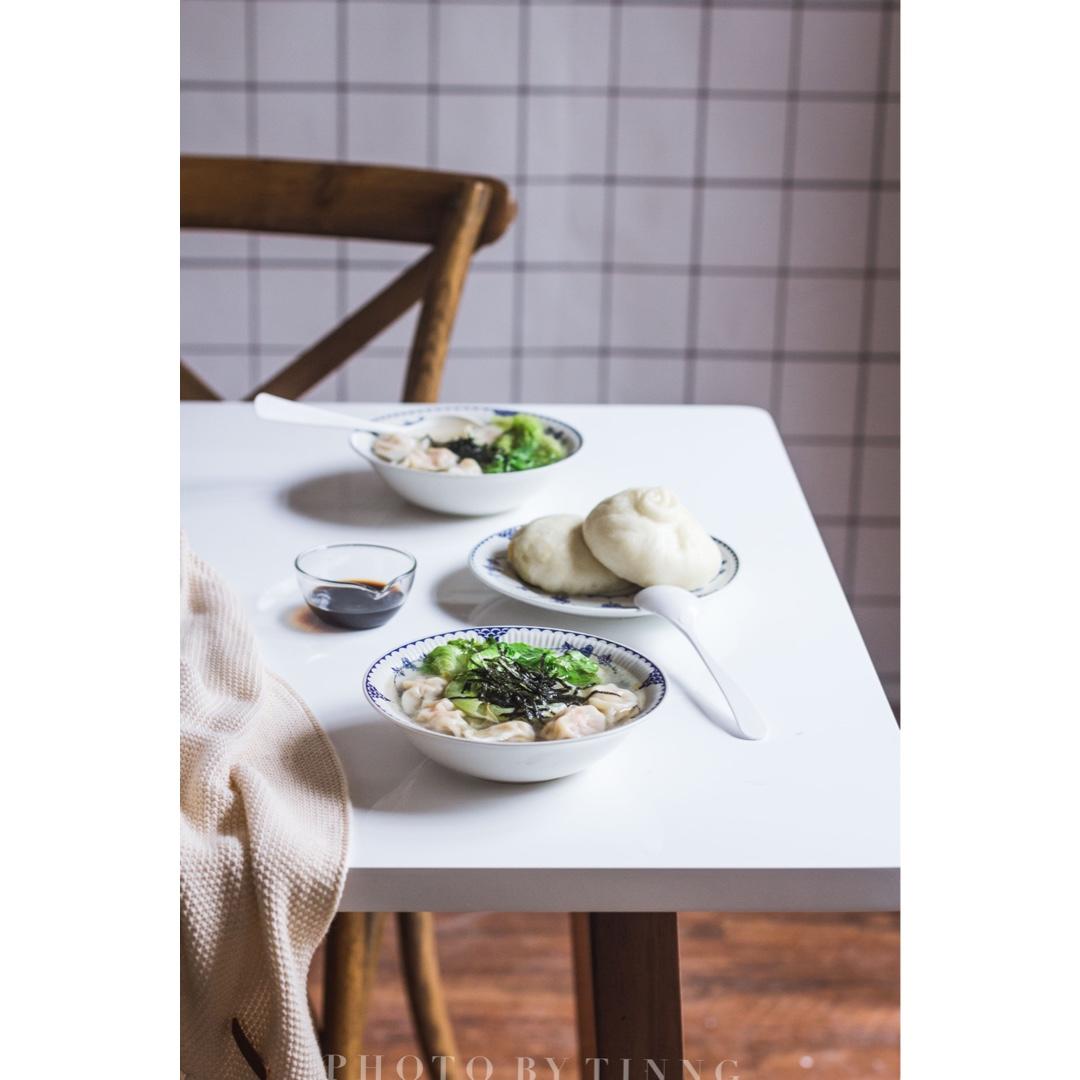 来传我阿总的!用速冻饺子山寨了小馄饨,鲜虾肉的还挺好吃~工作室的新墙纸和餐桌是不是浓浓的北欧风!超级好看! #早餐•20...