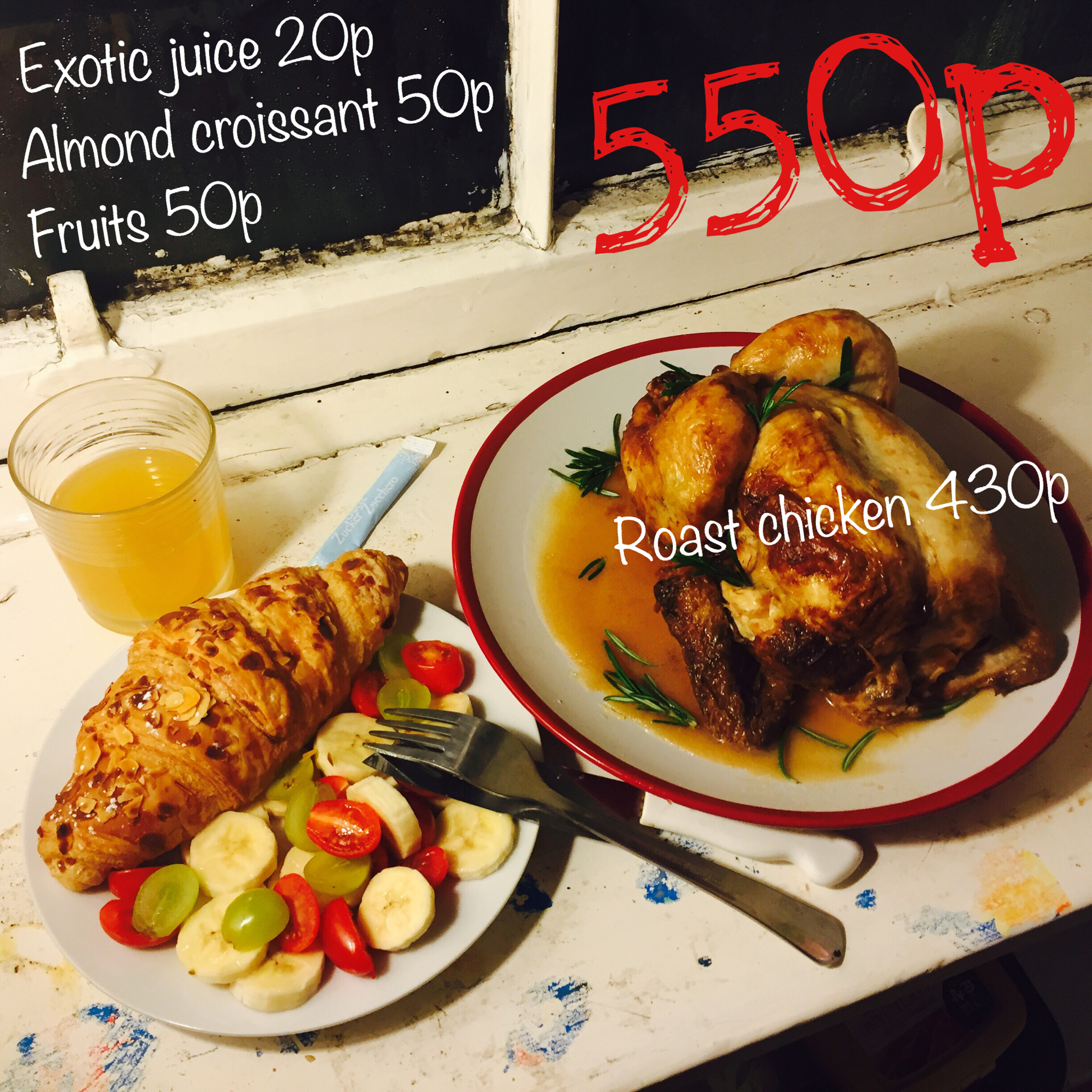 牛角包+水果们+烤鸡+果汁