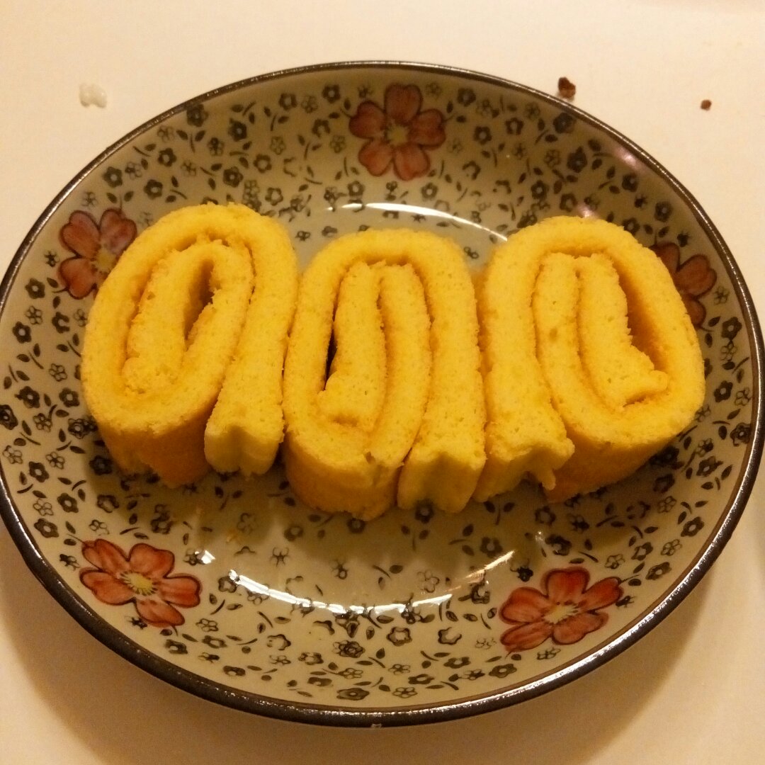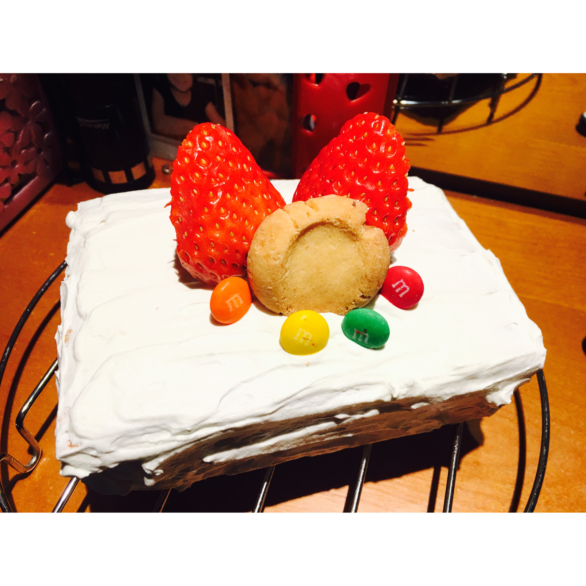 嘻嘻,因为是面包机做的蛋糕,只能是长方形儿,用勺子抹的奶油,也不是太光滑,不过鲜草莓的颜色真好看,没啥装饰,就插了一块儿...