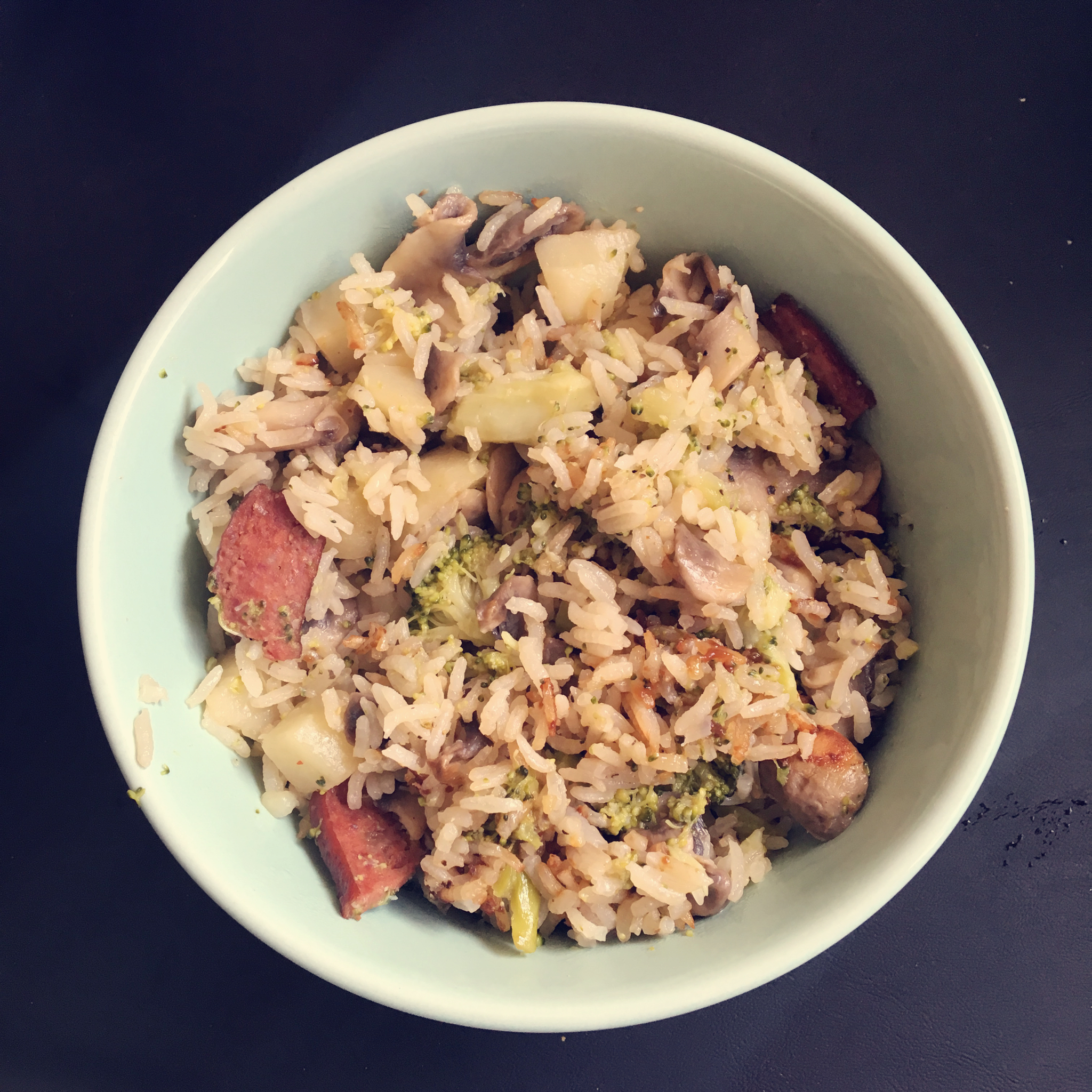 加了西兰花,蒸出来后都碎了……用的香肠,蛮好吃的~