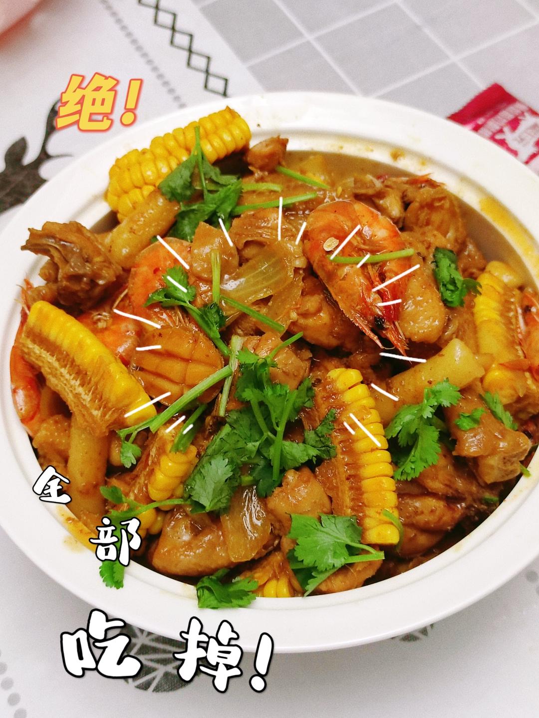 鲍鱼鸡煲虾,家庭版,可以加自己喜欢的配菜!好吃😋