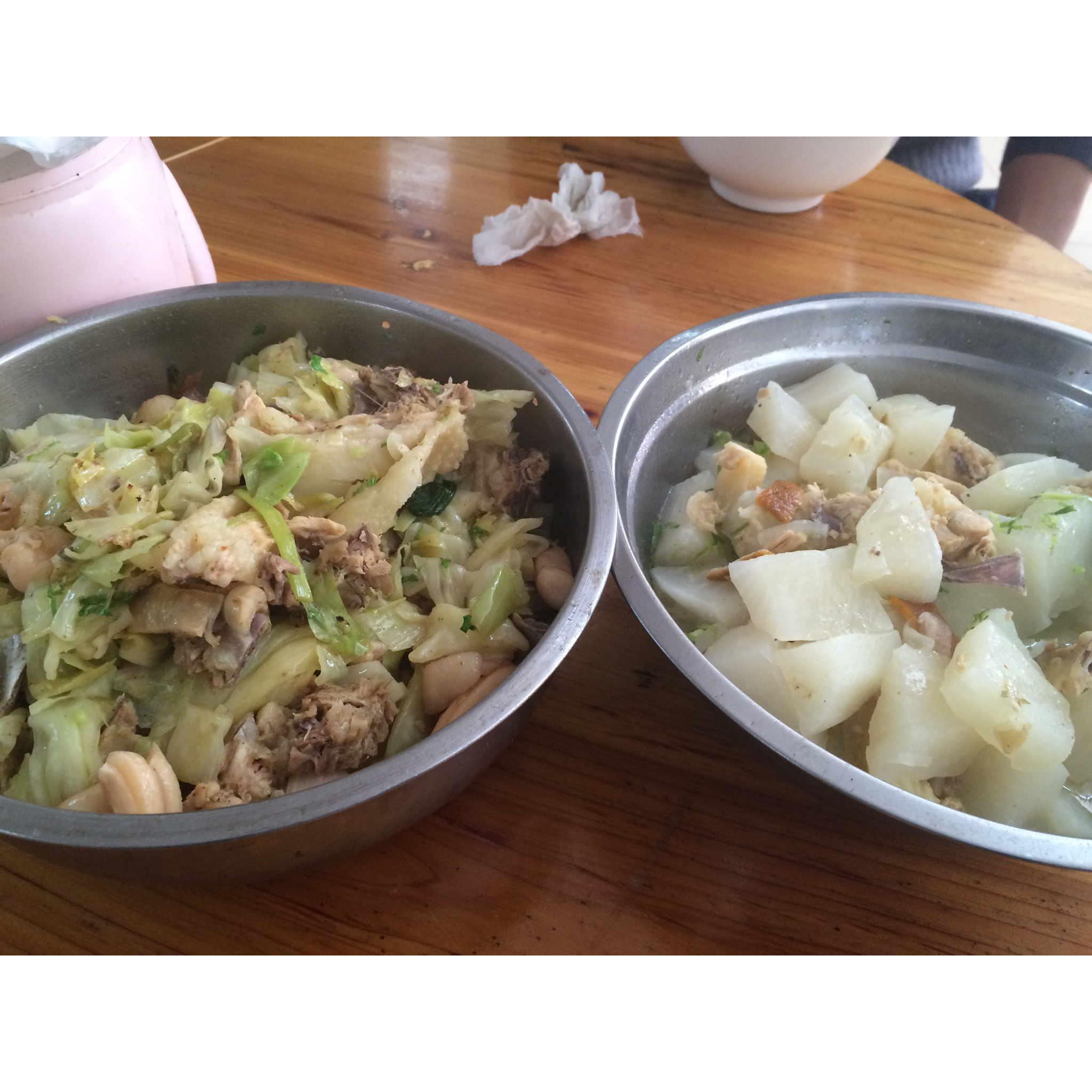 白萝卜焖白萝卜,椰菜炒鸡肉,很好吃,多吃也不腻,