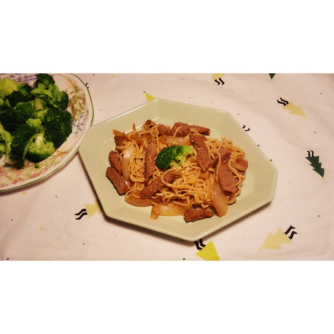 黑椒洋葱牛柳炒面和西兰花