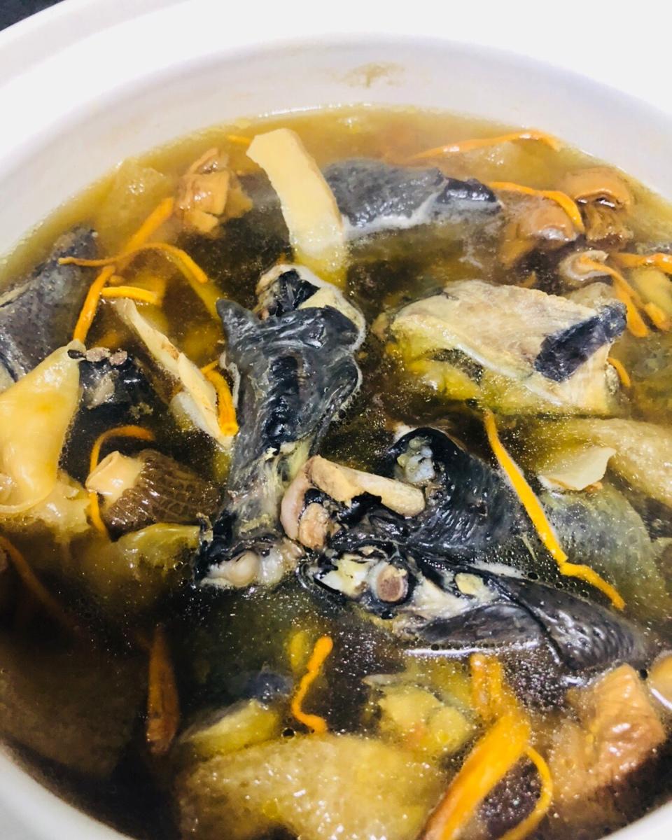 乌鸡花胶汤,配羊肚菌,竹荪,虫草花,姬松茸