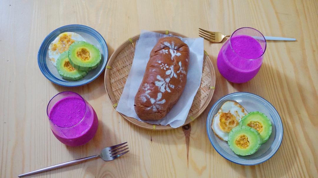 巧克力麻薯软欧、火龙果奶昔、鸡蛋还有蜜瓜#小女...