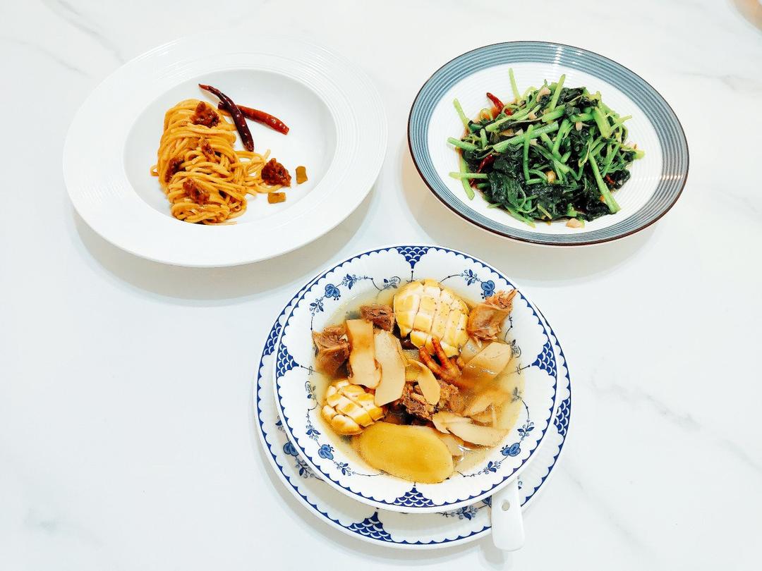 淘宝上买的热干面材料,自己回来煮的,还加了泡了一夜的黄豆,美味加倍,面条吃完很满足~