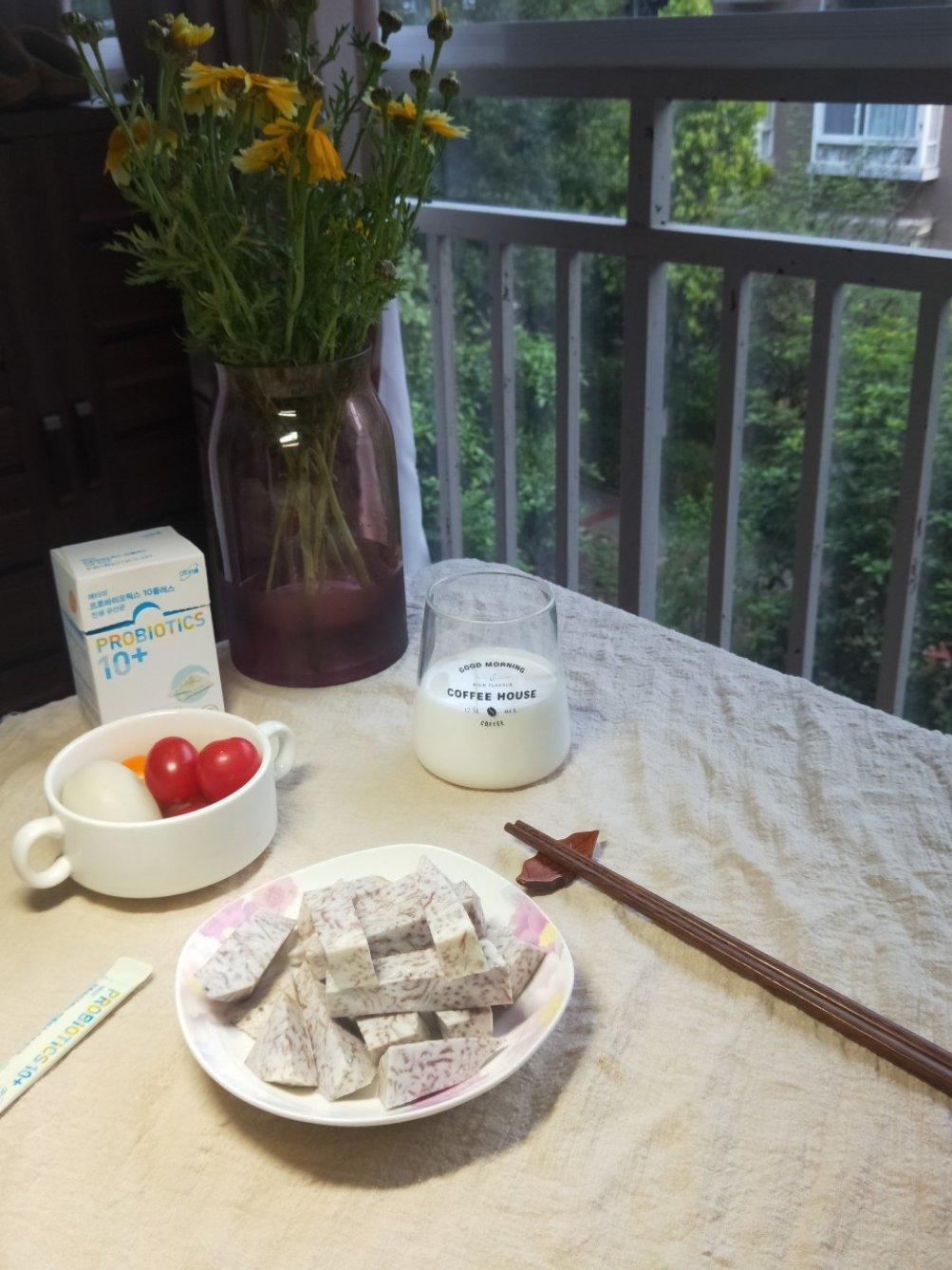 简单的早餐:清蒸荔浦芋头+水煮蛋+牛奶和适量水果