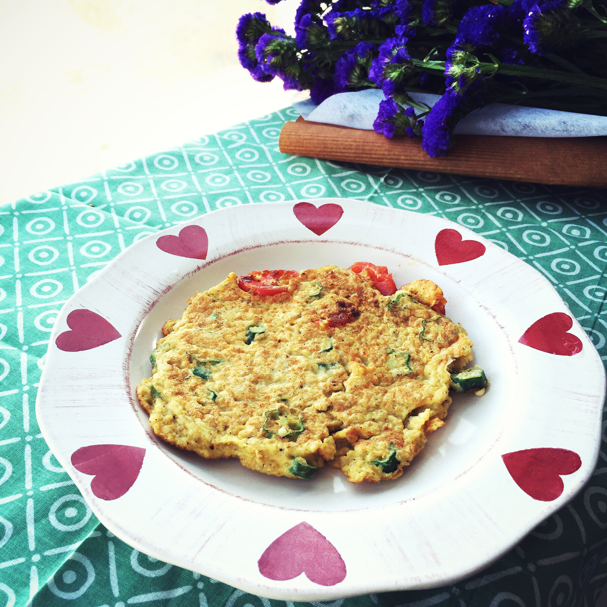 2016-03-23 麦片+鸡蛋+秋葵+小番茄,麦片先用少量开水浸湿,然后处理秋葵和小番茄,把所有材料放在一起,再打入鸡...