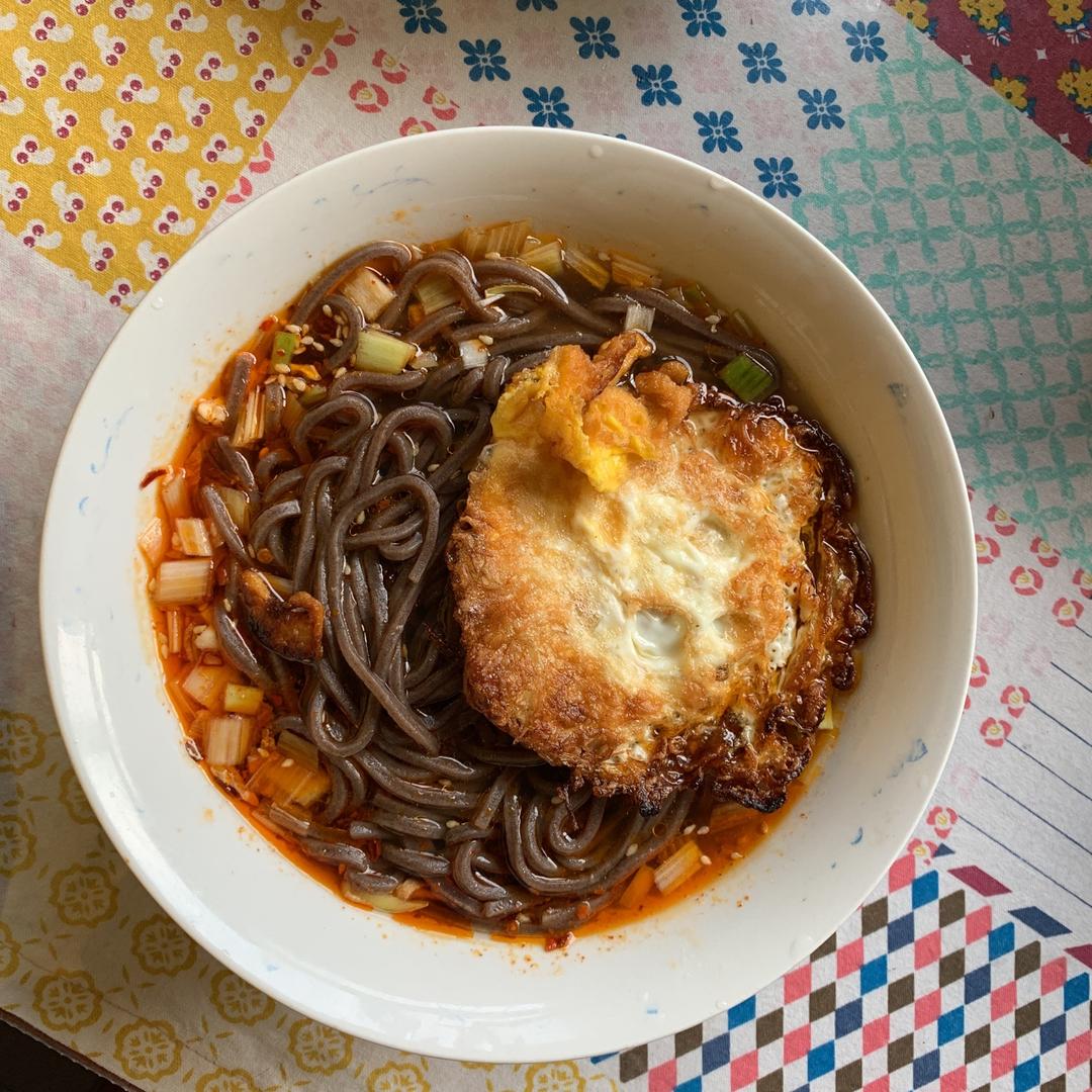 前天吃剩的麻辣香锅做面码,再加了些木耳莴笋,快快手做了一个酸辣汤面