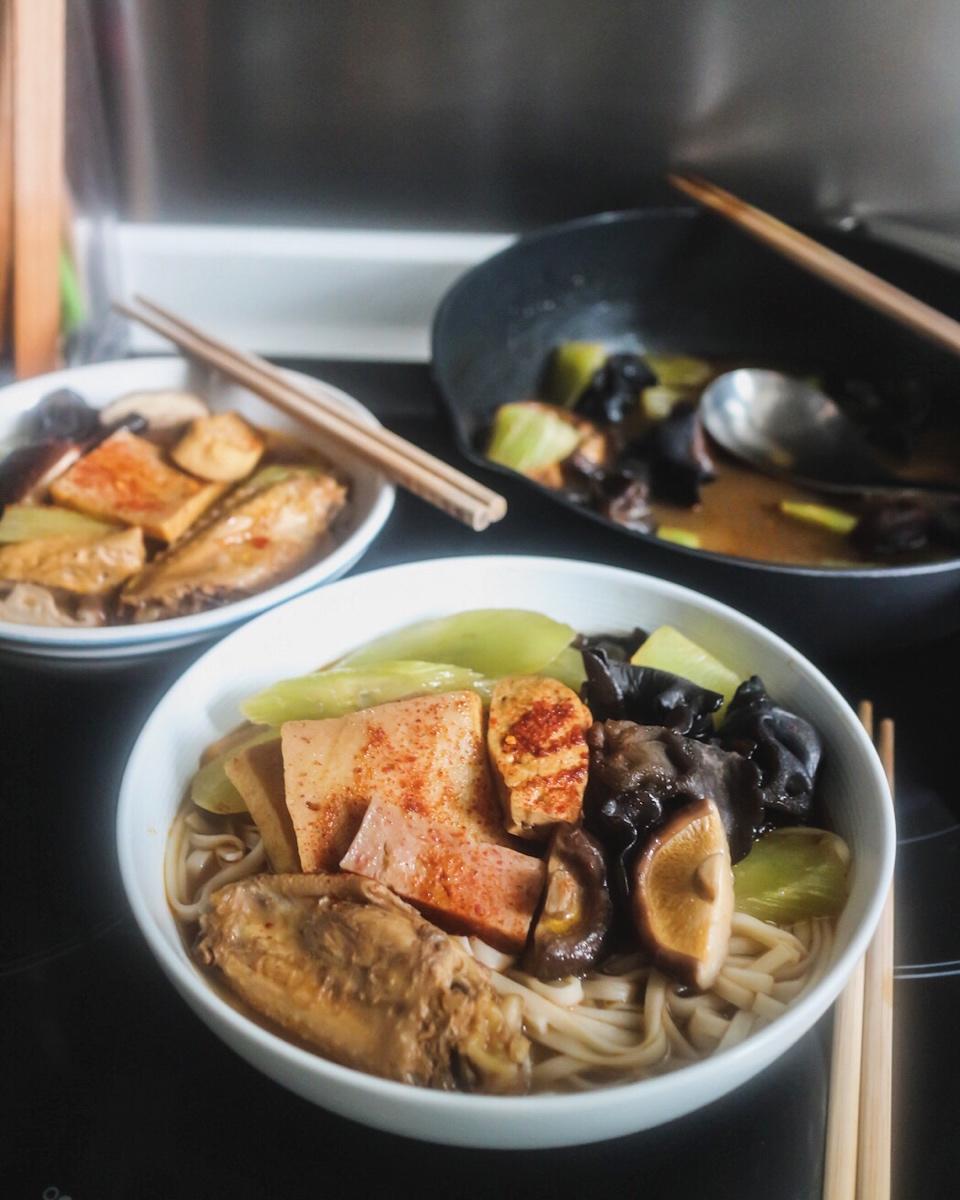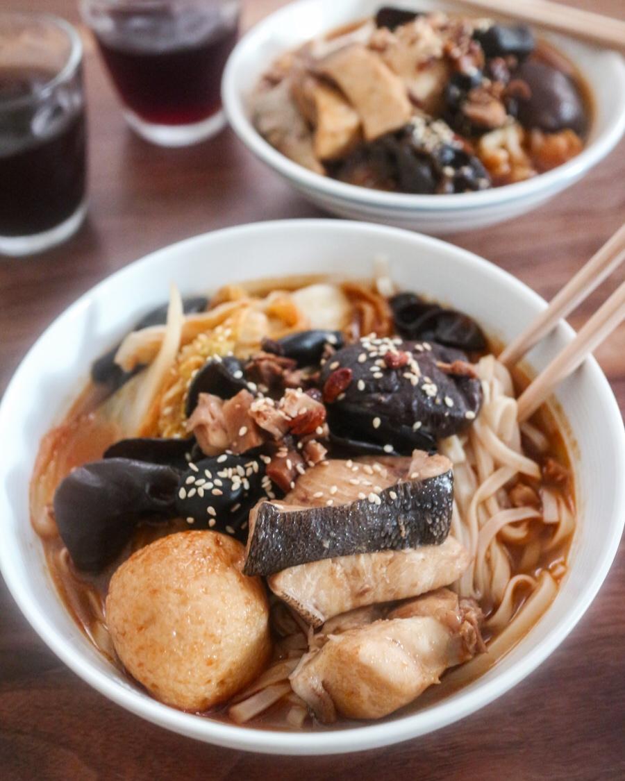 酸辣面,浇头有大鱼蛋、龙趸肉、木耳、冬菇、大白菜,没有特别搭配,就是冰箱里有什么煮什么