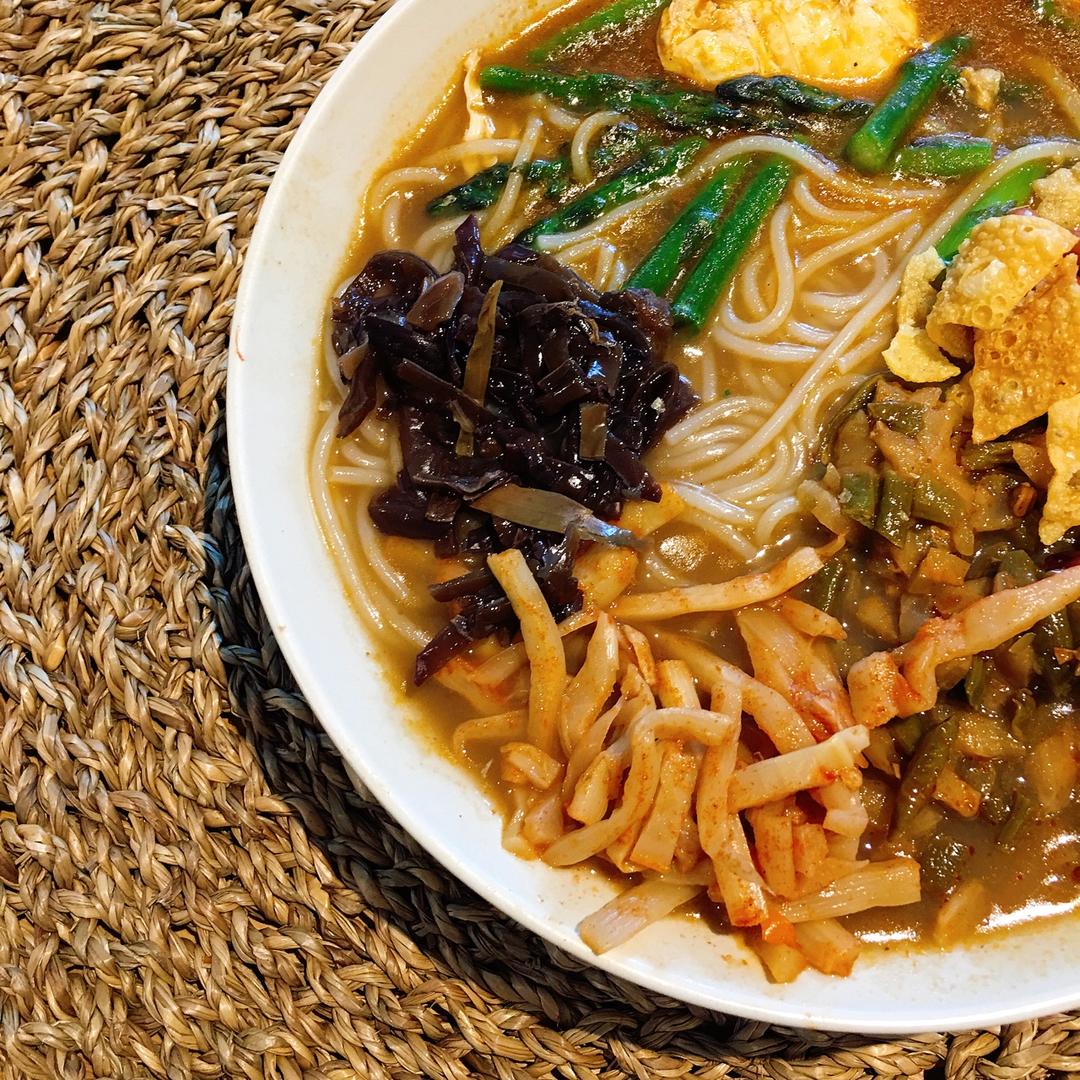 【好好吃每一顿饭】豪华版的螺蛳粉,自己还煮了溏心蛋和嫩芦笋,喷上辣油和白醋,齐活❤️