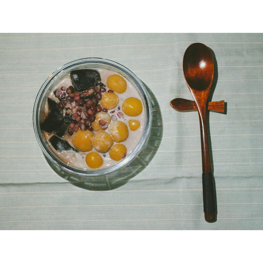 自己煮的红豆薏米汤+龟苓膏+奶油~其实红薯蒸出来有点变绿了 做的圆子也是绿绿...