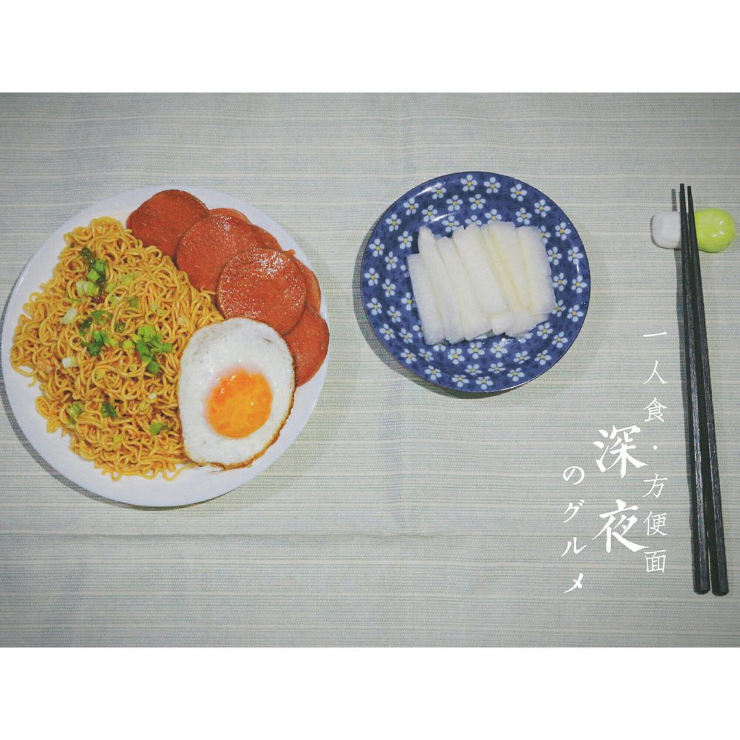 甜辣酱拌面+煎火腿+溏心荷包蛋+腌萝卜😁