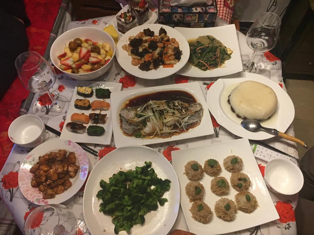 #晚餐•2019年2月4日#今年过年,三口聚齐。做了一桌好吃的菜柠汁八宝饭,糯米丸子,清蒸鱼,寿司,八宝菠菜,烧虾段,油...