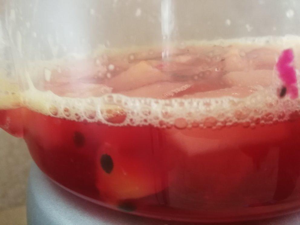 #最美年夜饭#第一次尝试,家里没有红茶包有些手忙脚乱。一个熟透的百香果,小半个红心大火龙果,半个苹果,一个小橙子。