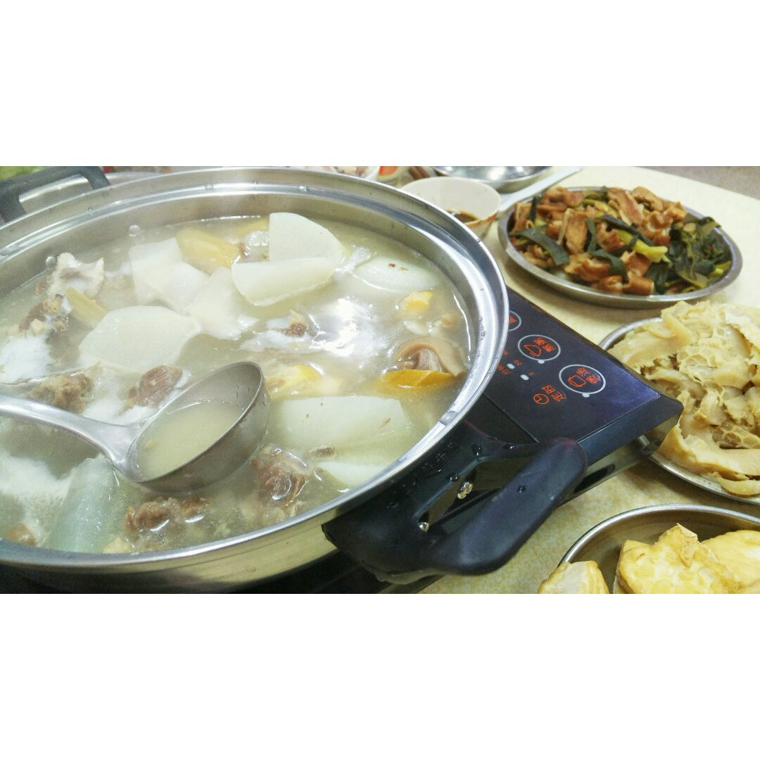羊肉火锅是今晚的主菜,煮好的牛肚和豆腐都是烫热了就可以吃。猪肠炒大蒜,潮汕话“猪肠蒜,食了有钱...