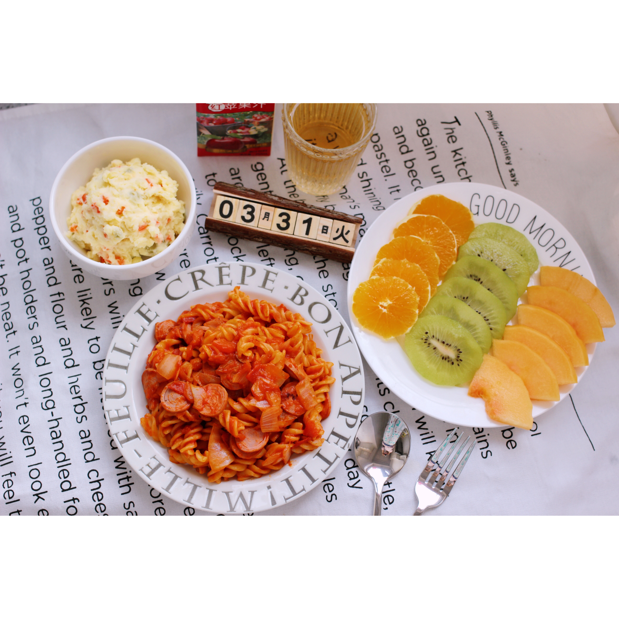 番茄火腿意面/土豆泥沙拉/水果拼/苹果汁
