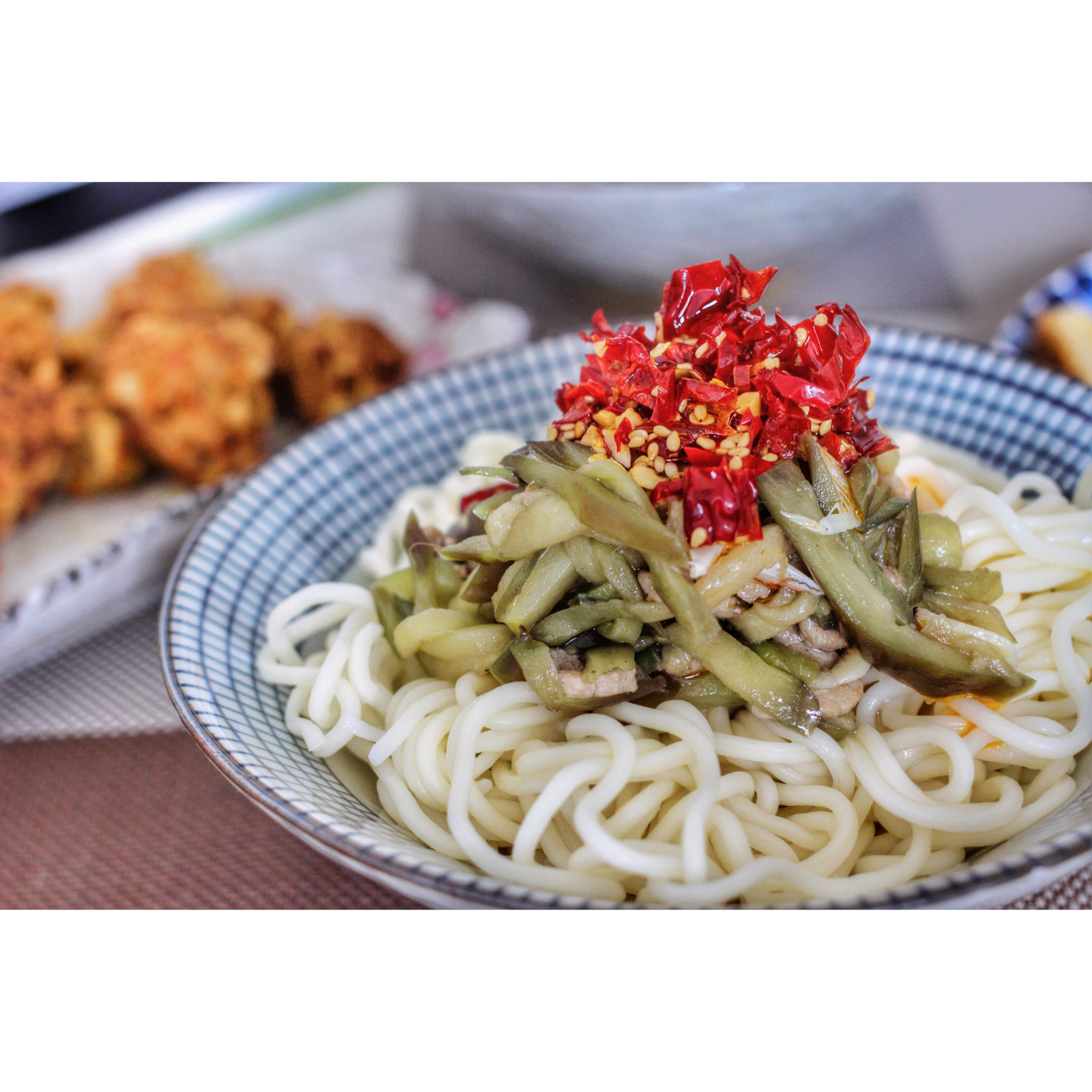 茄子肉丝卤的面条配上红油辣子,好爱这么吃