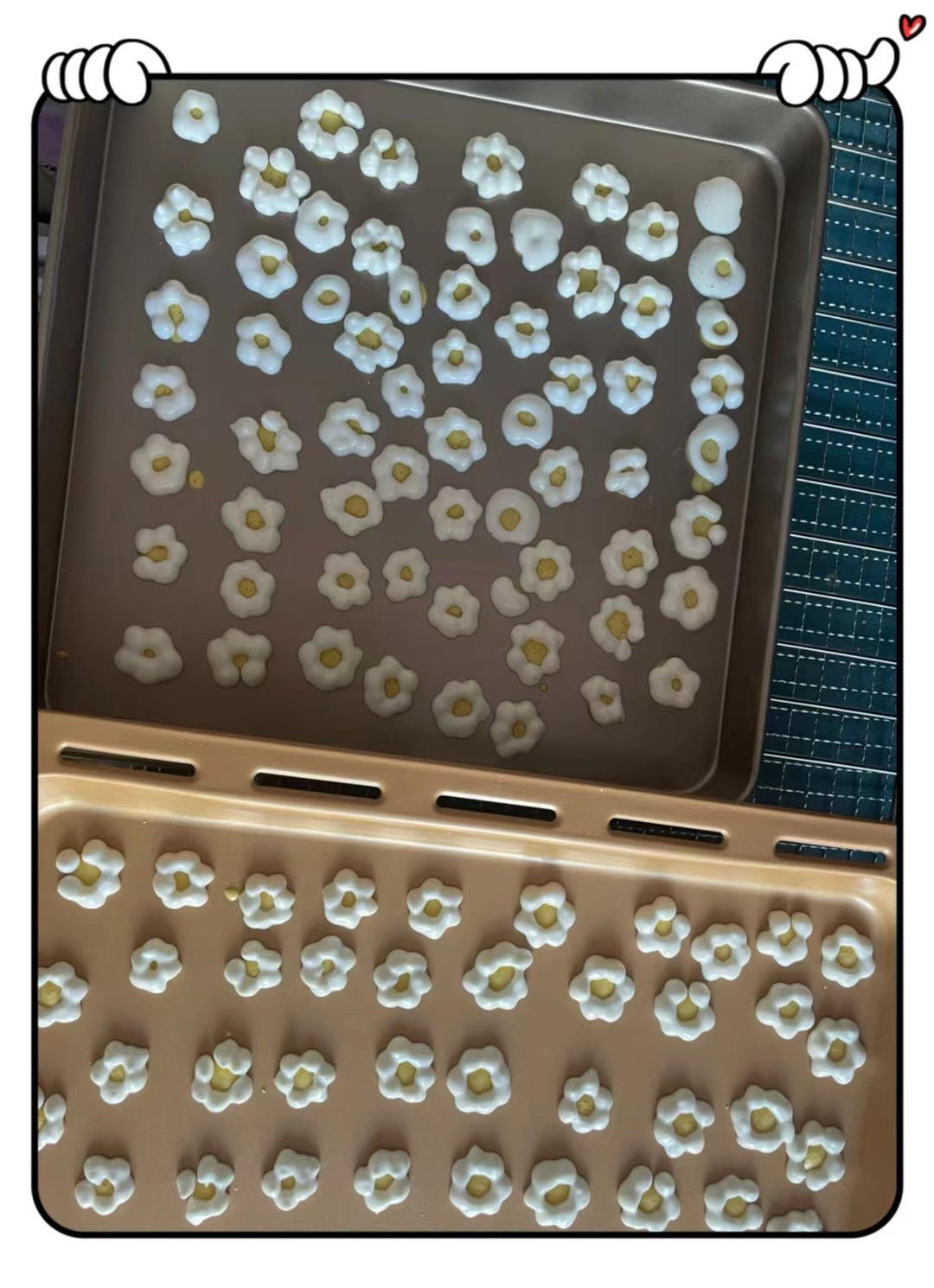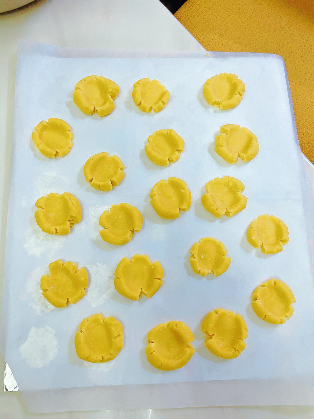 方子简单但还是被我搞错了:黄油未经打发直接和面粉淀粉蛋黄奶粉一起搅拌了,最后面团有点不粘,又补了一点稠酸奶搞定。