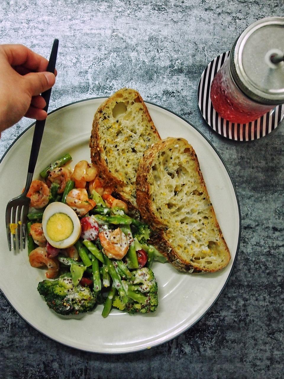 芦笋沙拉(酱汁依然是常用的无油酸奶沙拉酱汁)、杨梅汁加苏打、多谷物乡村硬欧两片、还有一颗卤蛋。