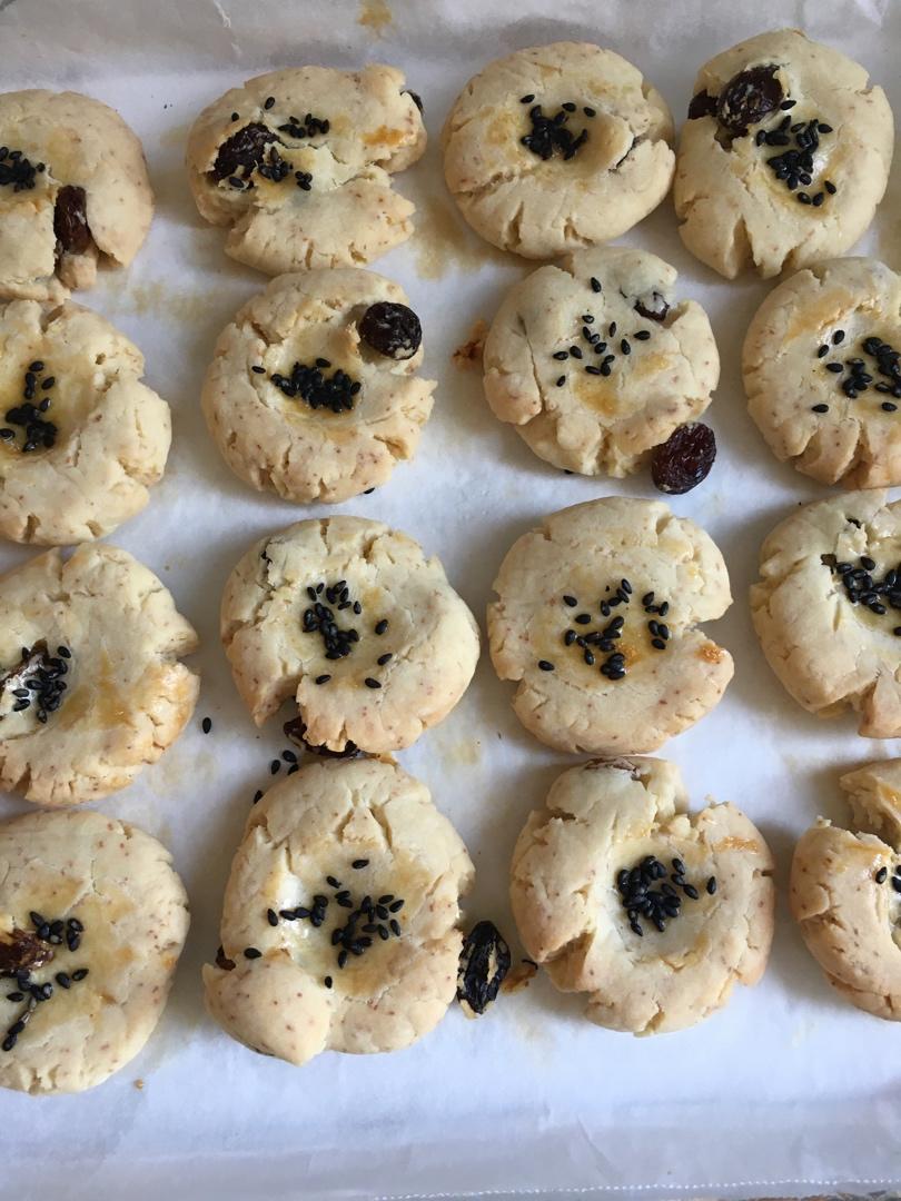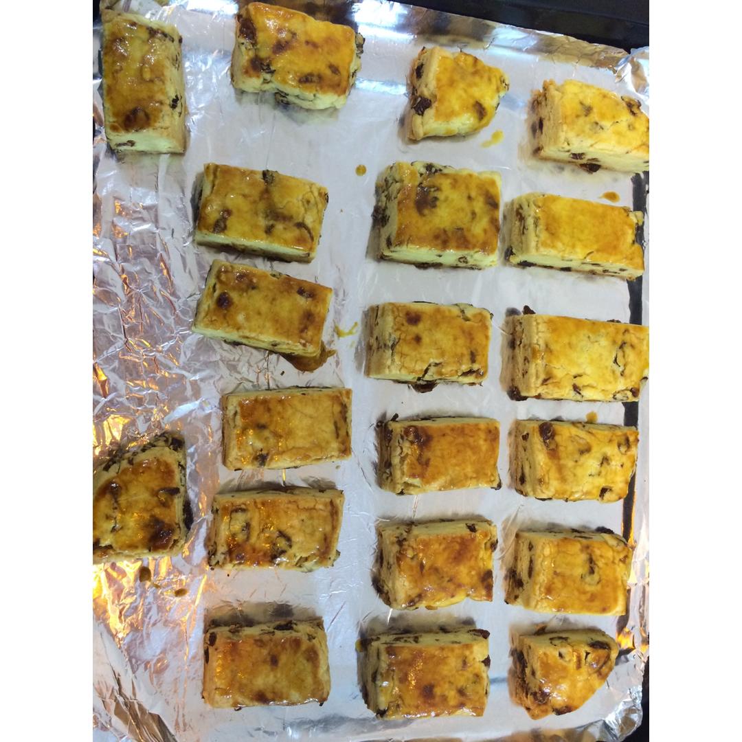方子很好,特别酥脆!虽然已放冰箱冷藏一小时,还是不太好整形~而且,因为有葡萄干的存在,导致一切片就会散开,花了...