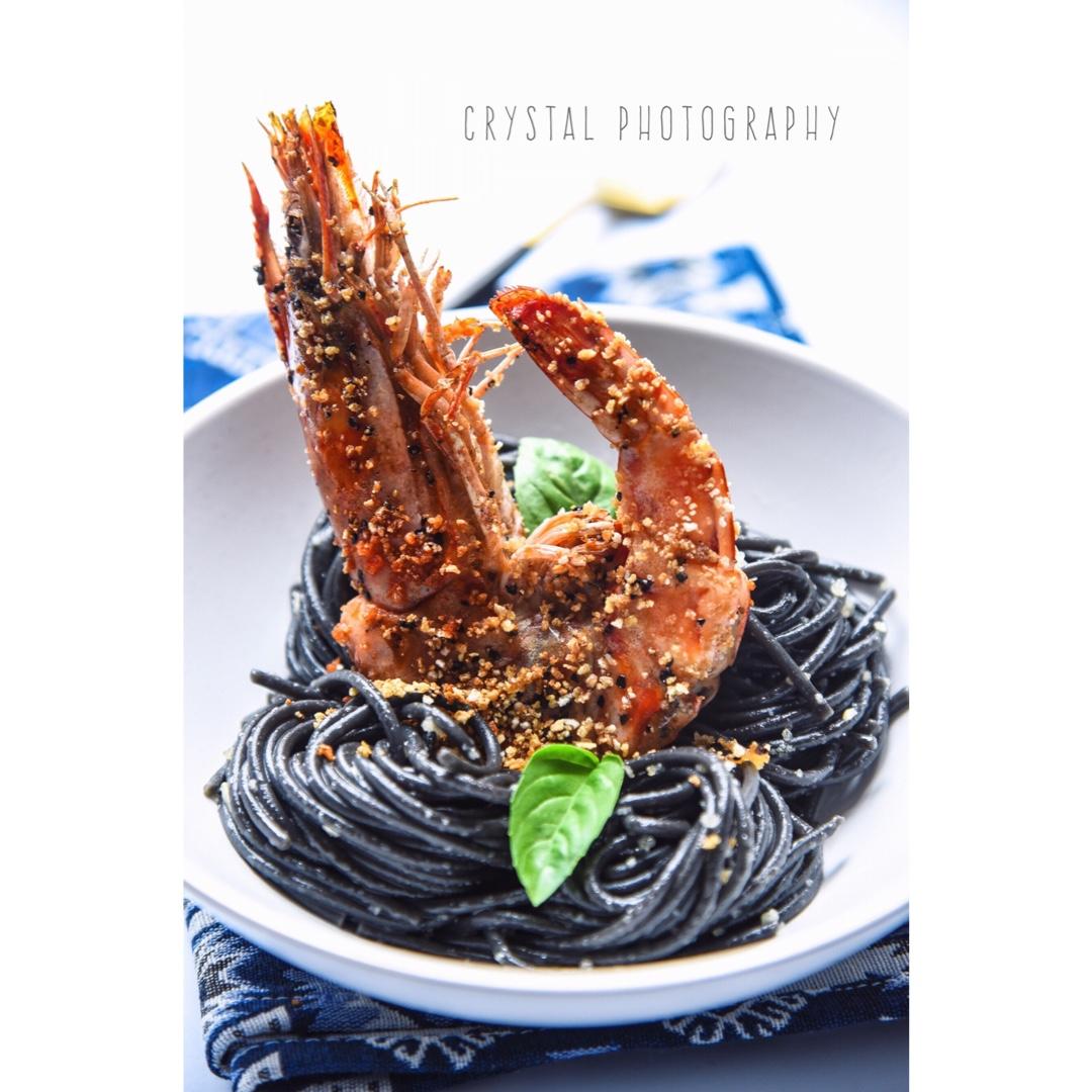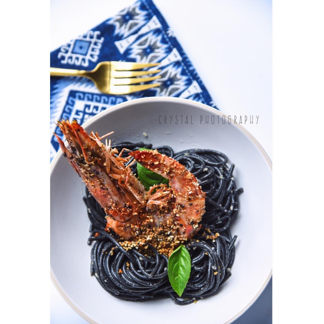 超超超大只的竹节虾,裹上面包糠煎一下脆脆的~~这次依旧蒜油墨鱼面,麻麻的最爱~~~ #早...