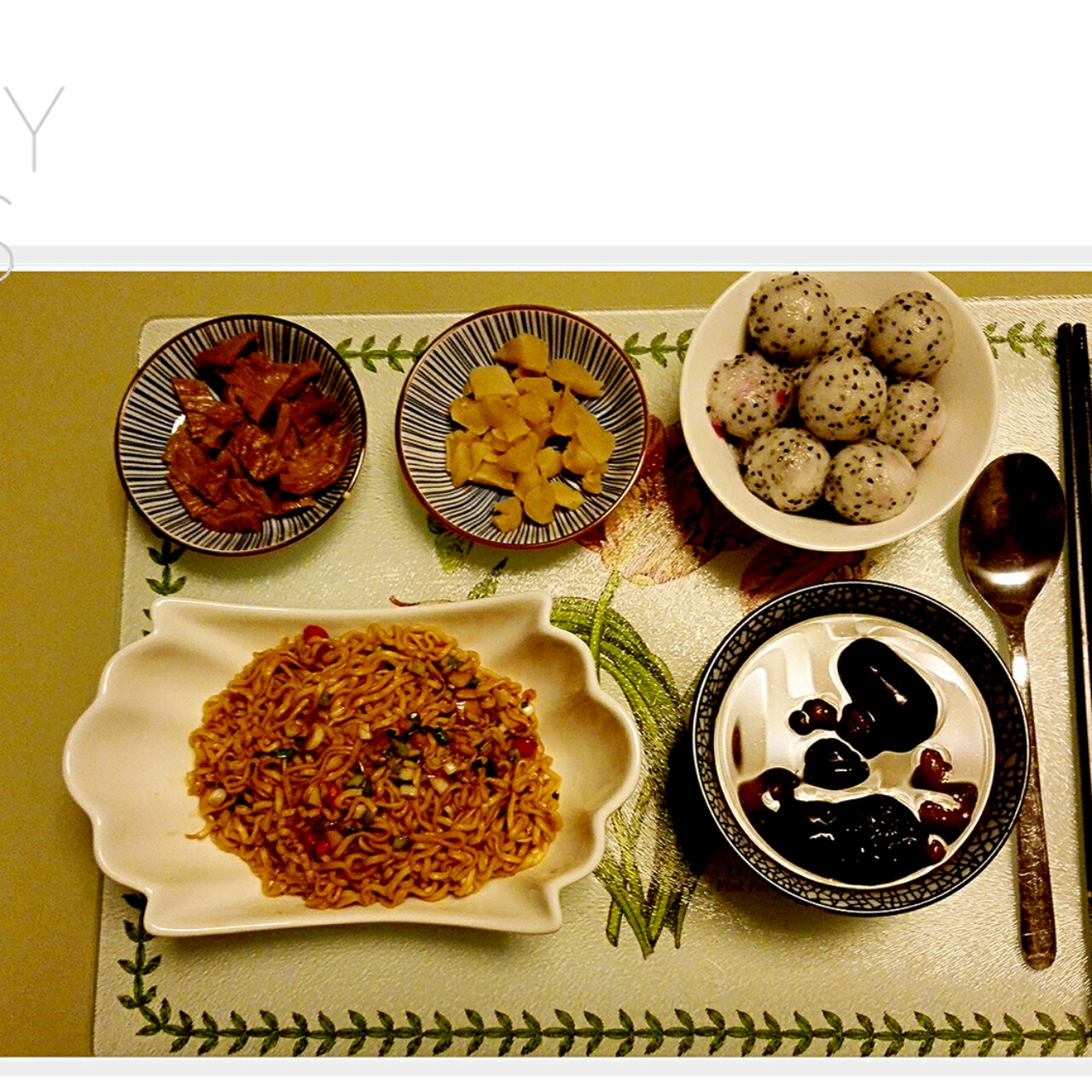 早餐:葱香拌面,红枣红豆提子汤,火龙果,五香萝卜干,卤腐竹