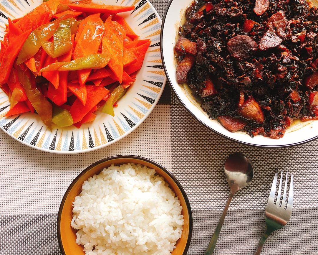 我的配方:胡萝卜,麻油,海盐一勺,糖两勺,一勺水。我没香葱,但这样炒也很好吃😋