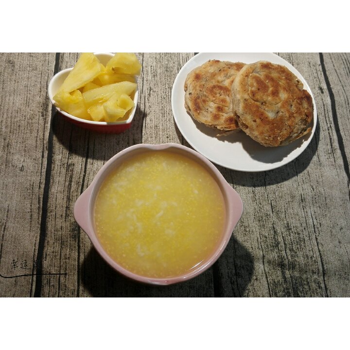 宝贝的健康早餐!玉米粥,芝麻核桃饼,菠萝。这是今天的早餐😜😜
