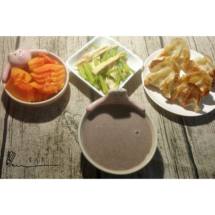 宝贝的健康早餐!煎饺子,芹菜腐竹,红豆薏米糊,木瓜。