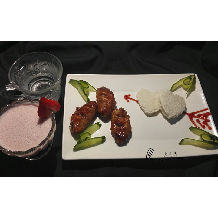 宝贝的健康早餐!可乐鸡翅,馍片,草莓苹果奶昔。