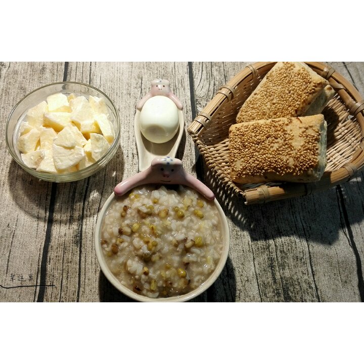 宝贝的健康早餐!芝麻葱香饼,绿豆粥,白煮蛋,苹果沙拉。