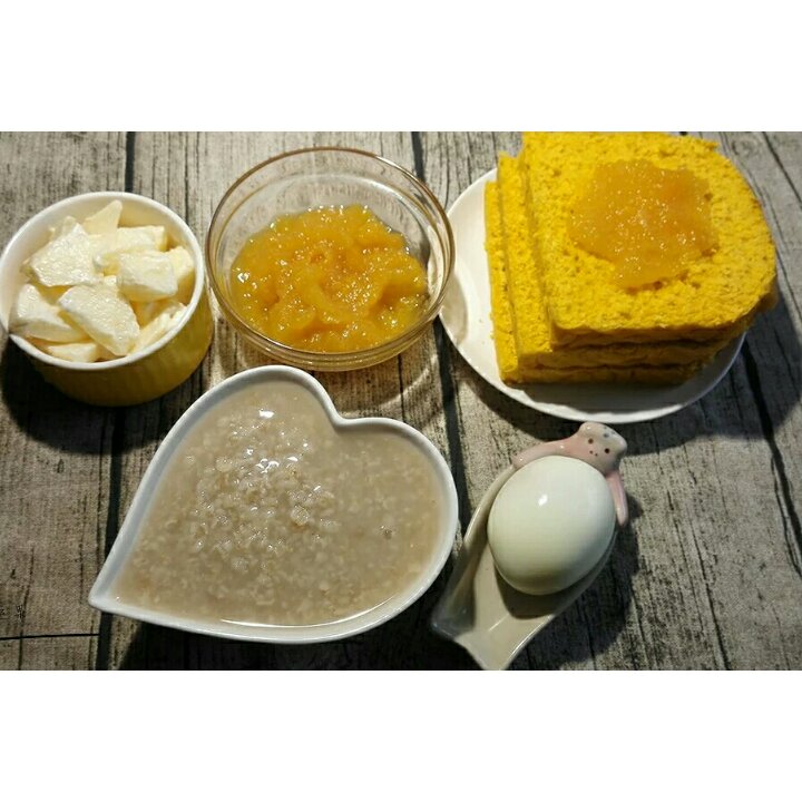 宝贝的健康早餐!南瓜土司+菠萝芒果果酱,白煮蛋,燕麦粥,苹果沙拉。(又一...