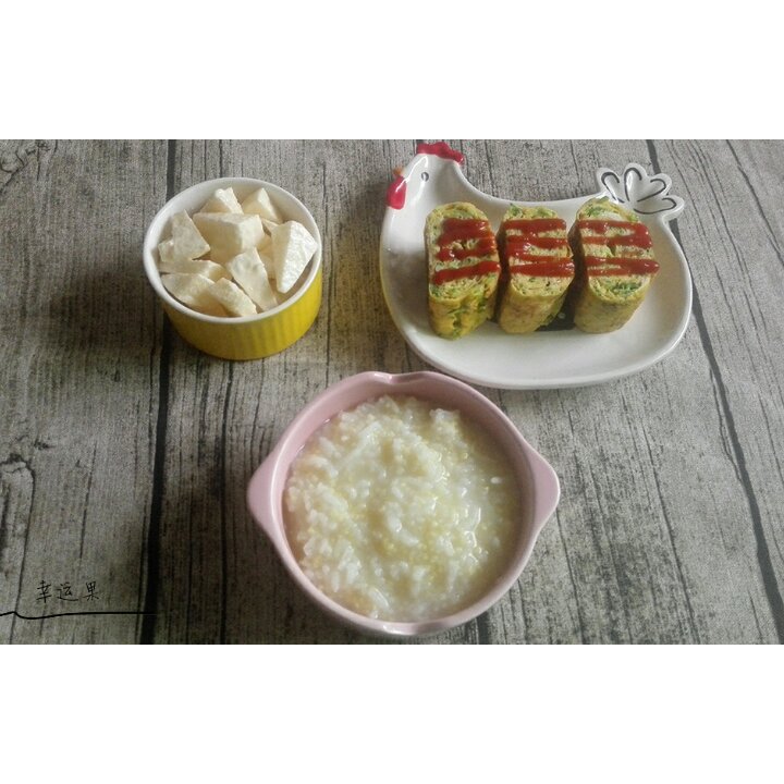 宝贝的健康早餐!黄瓜厚蛋烧,小米粥,苹果沙拉。(星期天看了一天的柳大尉,...