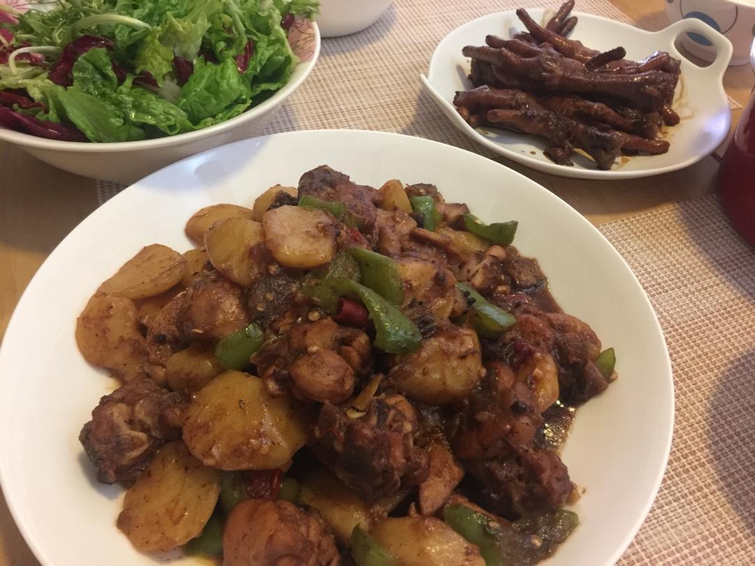 圣诞节的大盘鸡、卤鸡爪、冬阴功、沙拉。美味、精致。