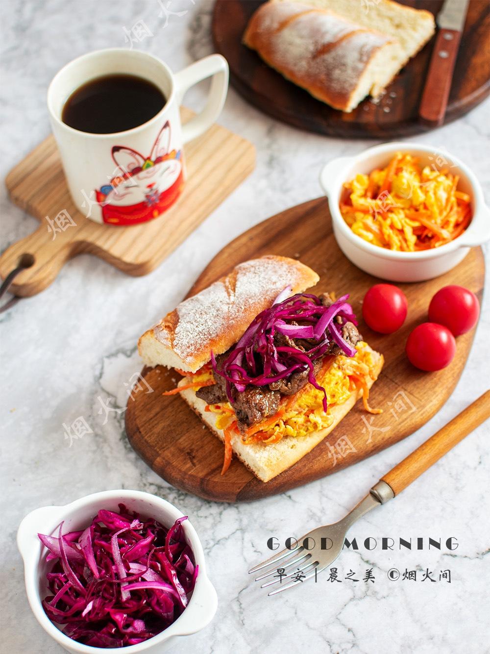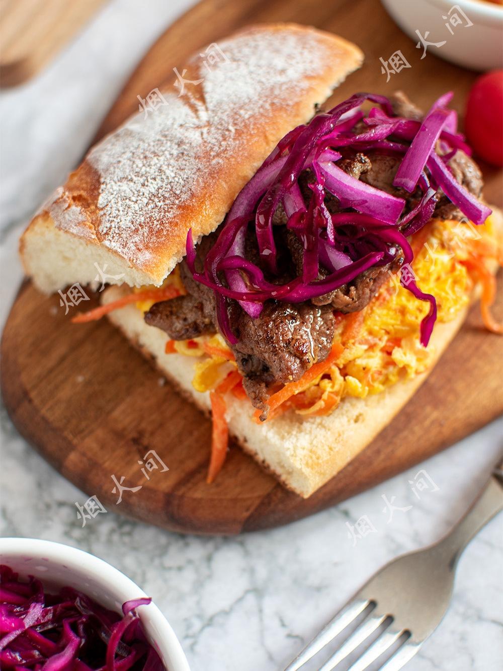 夹了胡萝卜炒蛋+牛肉+紫甘蓝,