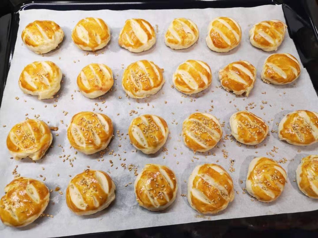 油酥有点太黏,揉的时候又加了面粉,卷了3次面皮太干了,下次做卷2次就够了,方子的量做了24个,饼还可...