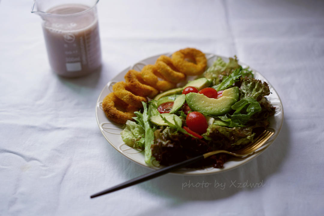 早餐,杂粮米糊,洋葱圈,牛油果沙拉。