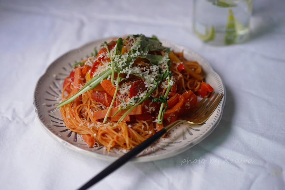 早餐,彩椒番茄培根意大利面,青柠水。