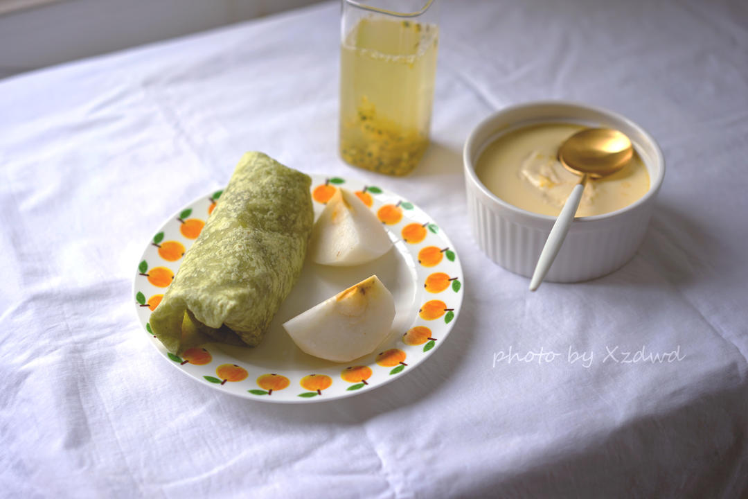 早餐,卷饼,牛奶炖蛋,百香果蜂蜜水。